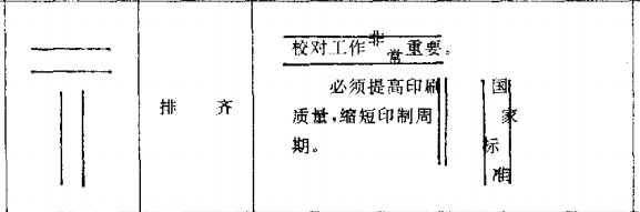 八是排齐符。用于改正字符参差不齐、或高或低、或左或右(竖版时)的现象。形态为横或竖的两根平行线,表示将平行线内的字符上下、左右对齐。这个符号与上下、左右对齐符一样,都有将字符对齐的功能。他们的区别是:极个别字符需要对齐时,用上下、左右对齐符;在同一行有较多字符需要对齐时,用排齐符。