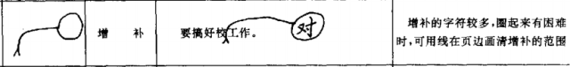 增补符的形态类似顺时针旋转90°的单书名号,用时插入到要增补内容的位置,然后将增补内容圈起,两者用线相连。只有当增补内容较多,无法圈住时,增补内容才可出现在页边。