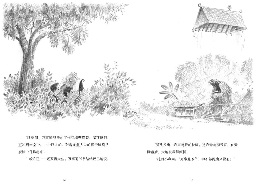 ◎奇姆·甘博绘画的《冒险王扎西》插图,万事通爷爷的儿子造出的狮面怪兽