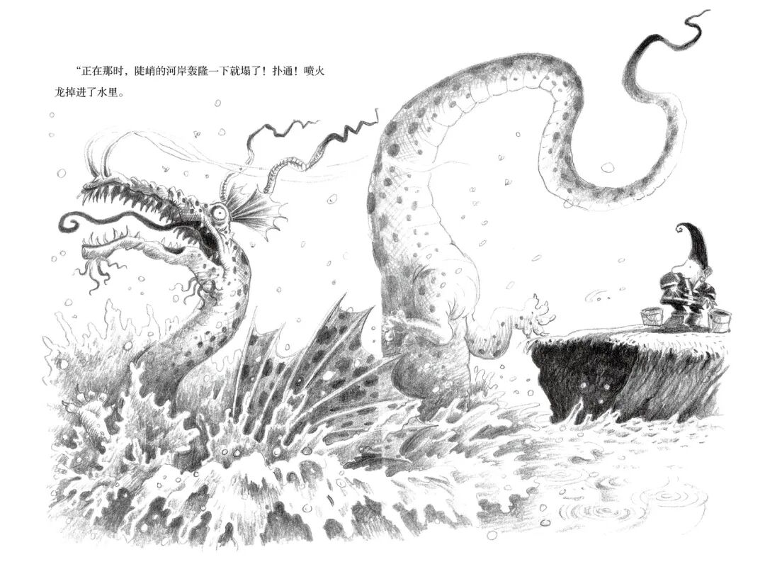 ◎奇姆·甘博绘画的《冒险王扎西》插图,扎西遇到了喷火龙