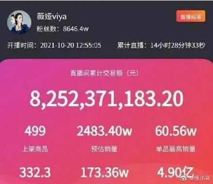 2021年10月20日晚,双十一预售薇娅再次打破带货纪录,销售额达到82.52亿元……