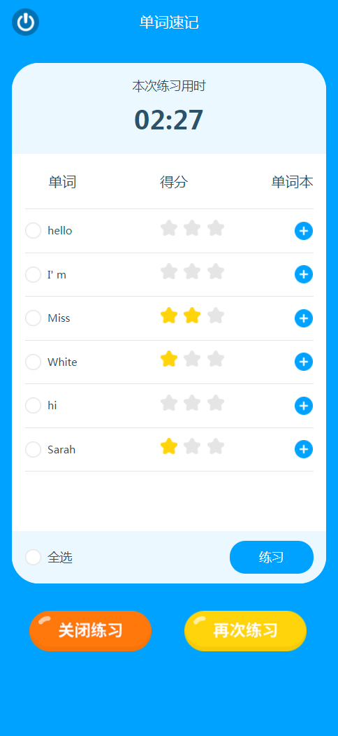 点“再次练习”可以再练习一遍这组单词,点“关闭练习”后进入下一关。