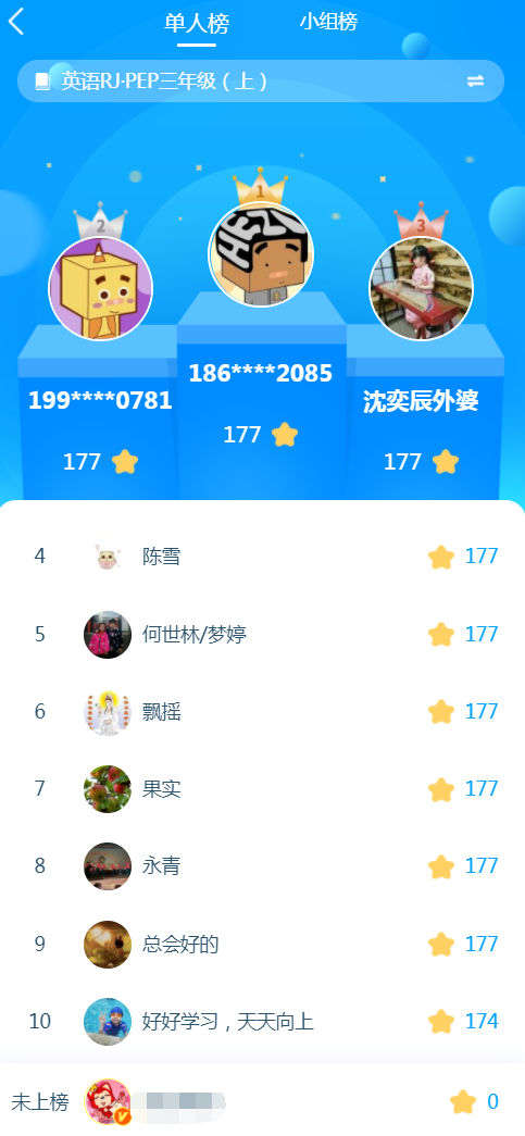 点击页面右上角的奖杯图标,可以查看排行榜,最下方一条展示的是本人的排行。