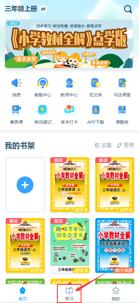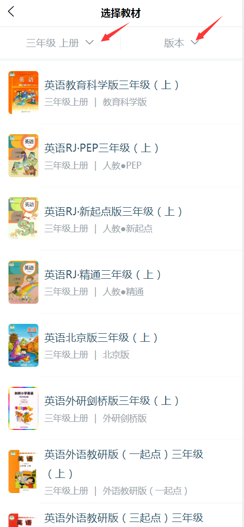 进入教材选择页面后,可以点上部的年级、学段和版本处进行筛选