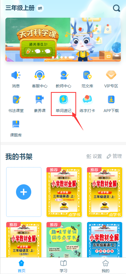 进入单词速记后,点击中间年级和版本信息处,选择教材版本