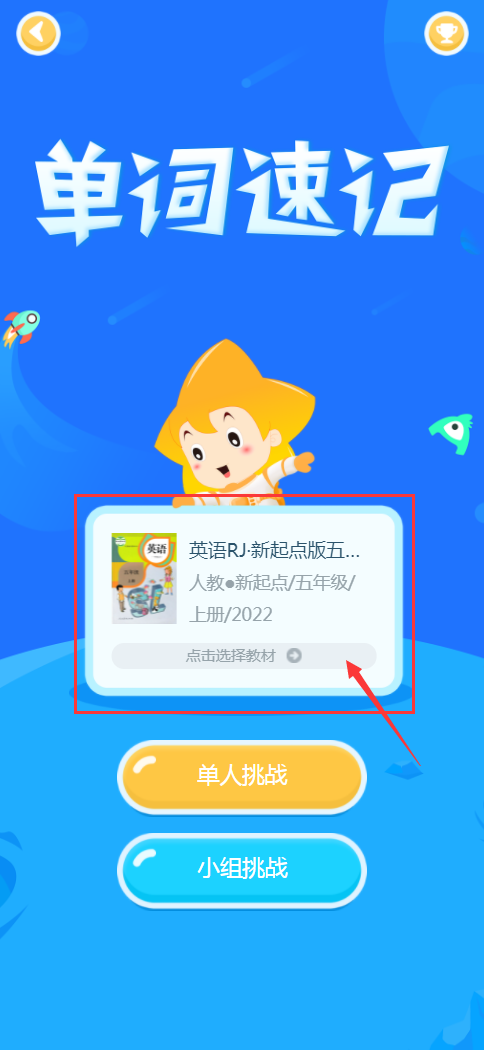 选择好教材版本后,返回到单词速记首页,选择“单人挑战”或“小组挑战”模式开始挑战闯关