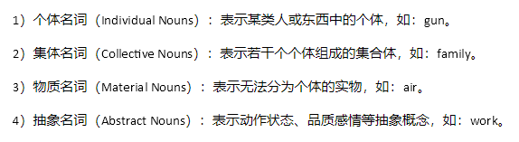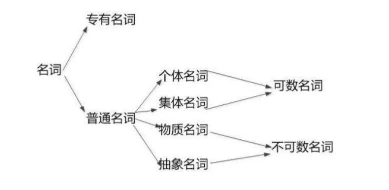 个体名词和集体名词可以用数目来计算,称为可数名词(Countable Nouns),物质名词和抽象名词一般无法用数目计算,称为不可数名词(Uncountable Nouns)。归纳一下,名词的分类可以下图表示: