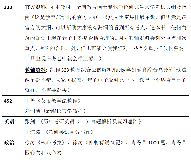 阅读教材,如果实在觉得自己时间不够用,可以直接看教辅资料(见表格)并做笔记,看不懂的再回归课本去看看书上怎么解释的,这是最低要求。我当时看了教育学原理和教育心理学的教材,中教外教没时间了就直接看的资料。对于做笔记,333做笔记千万不要抄书上的概念或者原理,非常浪费时间而且抄不完的(别问我怎么知道的)。可以看完一章写一个简单的框架,第二天拿出来复习一下,回忆昨天看了什么。框架是帮助我们记忆的,最理想的状态是合上书能自己画一个。