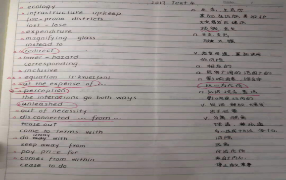 (1)单词:背单词不建议抱着单词书啃,出力不讨好。建议整理真题单词+墨墨APP中背高频考研真题单词,这样就足够了。我是早上在阅读中记忆单词,晚上睡觉前,在APP上刷一百个高频单词睡觉。真题里的单词我做到了非常熟悉,无论是低频的还是高频的。我印象最深刻的词就是buzzword这个词,历年真题中只出现了一次,算是低频的词,当时我背的时候我就没有把它当成很重要的词,只是眼熟,我个人觉得也不会出现第二次。但是今年阅读中竟然出现了这个词,我考场上立马就认得。所以真题中的单词非常非常非常重要,无论是低频的还是高频的,都要知道什么意思,说不定就考到了。下图是我如何整理单词