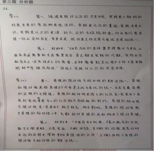 (1)关于政治大题,我推荐给大家一个神仙组合:腿姐的解题思路+背肖四大题。为什么这么推荐,我给自己估分是70分,因为我的政治选择题估分顶到天四十分,因为下完考场之后,我看了肖老的文章,肖老说,多选题很多四选的,但是我觉得我的四选的并不是很多,我没怎么对答案就知道我已经错了三道多选,但是为什么最后比我预测的高11分,是因为我大题得分高。就是因为我融合了肖老加腿姐,所以我这样建议大家。大家不要想着大题只背肖4就可以了,因为一旦你只背肖四,你会发现,到了考场,你觉得看到题你都会,但是最后你的得分并不高,原因就是因为你在卷子上看到了一样的字眼,就把你背的肖四上的大题给原模原样的搬到了考试卷子上,但其实你并不是很清楚这道题考什么,而且没有踩点答题。尤其是马哲大题,它的原理很固定,但是你不知道题目考什么,就是答不出来,反之你会读题,马哲很容易得分。因为政治大题更重要的是读题,解题思路,踩点答题,分条答题。文科改卷子都是一样的,分条答题,踩点给分,但是这里的分条不是一句话一条,而是像下图中,是一个层次,第一是理论,第二是材料分析。下图是我平时练习的答题情况,考场时我觉得比我平时练习的时候答得好,因为,考场上我写大题的时间很充足,所以字体写的比下图里写的认真。所以大家不能放弃政治大题,不能仅仅只背肖老,一定要听腿姐的答题思路,把二者结合起来,政治肯定不会给你拉分。