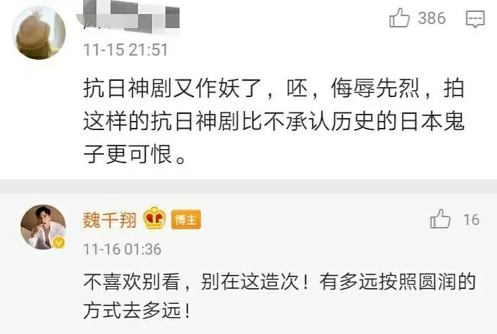 前段时间上映又下播的抗日题材剧《雷霆战将》,过于偶像剧的套路引发众嘲后,剧中的演员魏千翔也曾在网上在线怼骂网友。