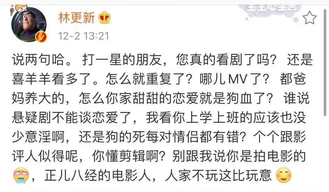 在这样不甘和不解之中,将矛头对准观众“开炮”的创作者,林更新不是第一个。