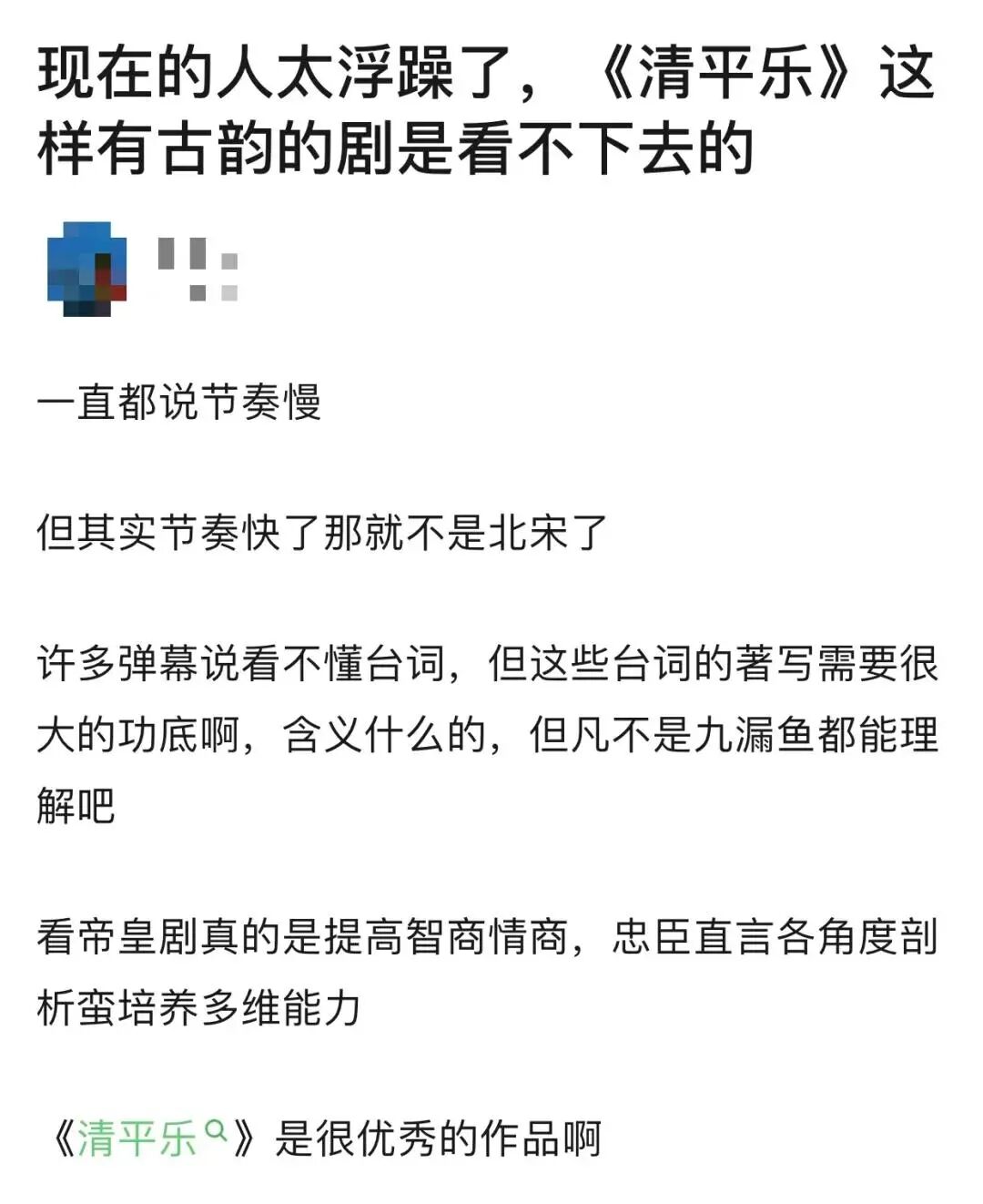 开年播出的历史传奇剧《清平乐》一经播出就陷入了两极评价。客观讲,剧中服饰考究,画面精美,可以看出创作团队的确下了很大功夫,但是观众指出的叙事节奏、故事情节、台词、人物主线等问题也确实存在,由此导致了不理想的收视率,却被包装成了观众对古典文化的知识水平不过关……