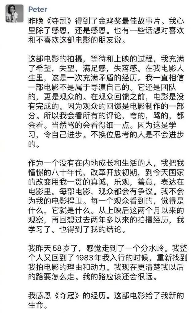面对新电影《夺冠》的口碑争议,导演过《甜蜜蜜》《中国合伙人》等众多佳片的陈可辛就表示,不会为自己的影片辩护,会把骂声看得更细一点,不换位思考的人是不会进步的。