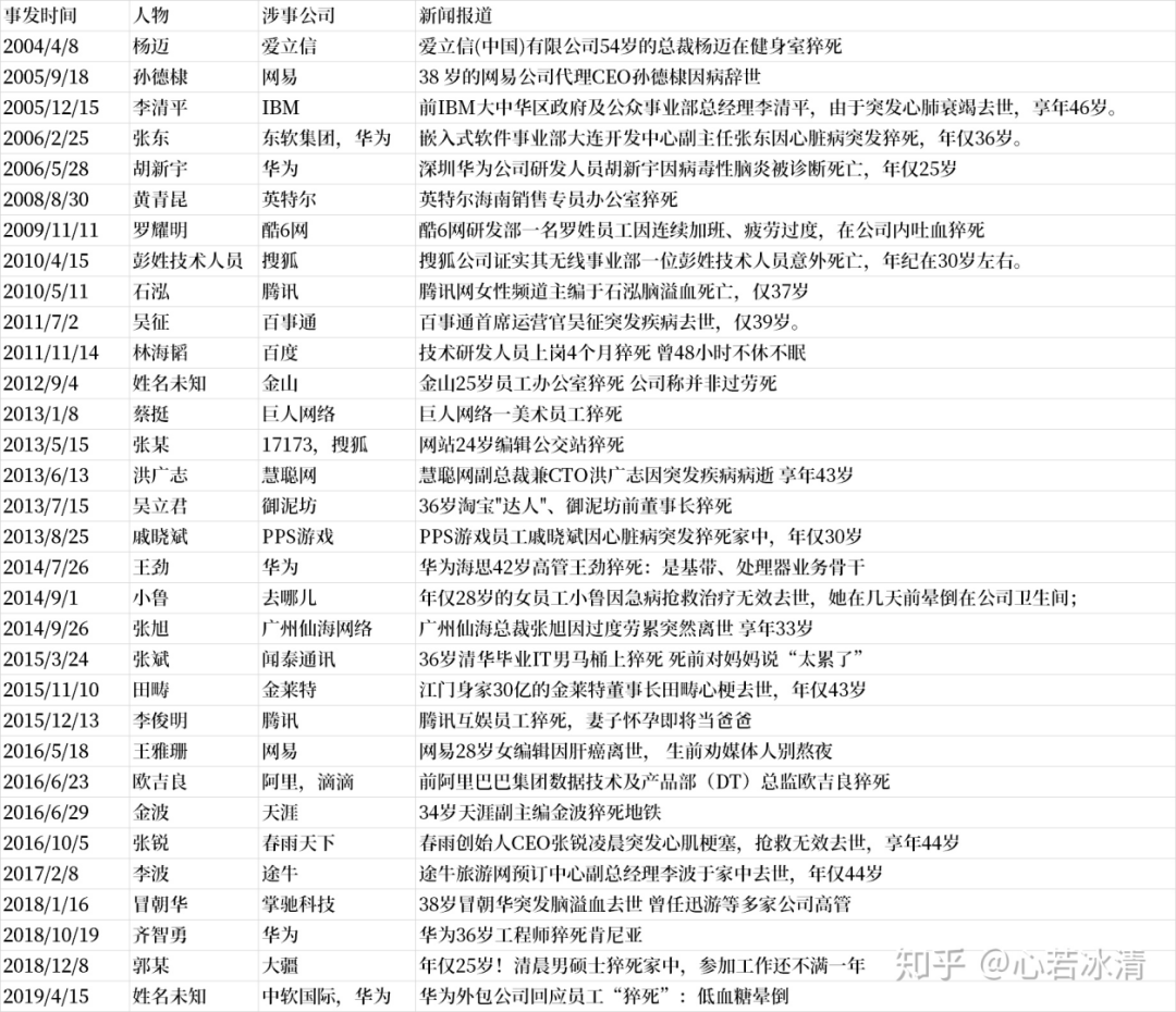 互联网行业猝死者不完全名单(2004年-2019年4月) / 图源知乎@心若冰清