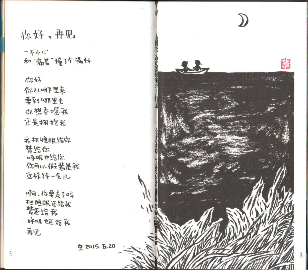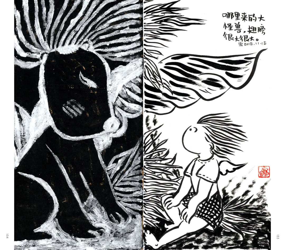 虫虫说:“绘画在这里只是一个记录的媒介。我需要用最简单和最快的方式来表达,去掉一切的困难和障碍,单色最快。其实我也画了很多彩色的画,但它们的记录性质没有这么明确。”