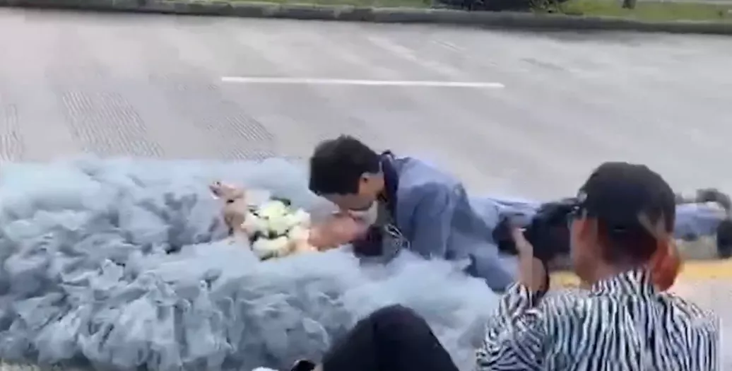 从视频中我们可以看到,一对躺在公路中央拍婚纱照的情侣沉浸在甜蜜的氛围中,摄影师也坐在旁边拍摄,所有人对路边的交通安全警示牌视若无睹,更不顾及过往车辆和自身的安全。