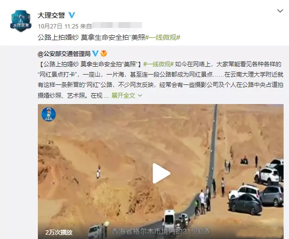 接着,大理交警也在官博上表示:切莫为了“美照”而置交通安全于不顾,莫拿生命安全拍“美照”。