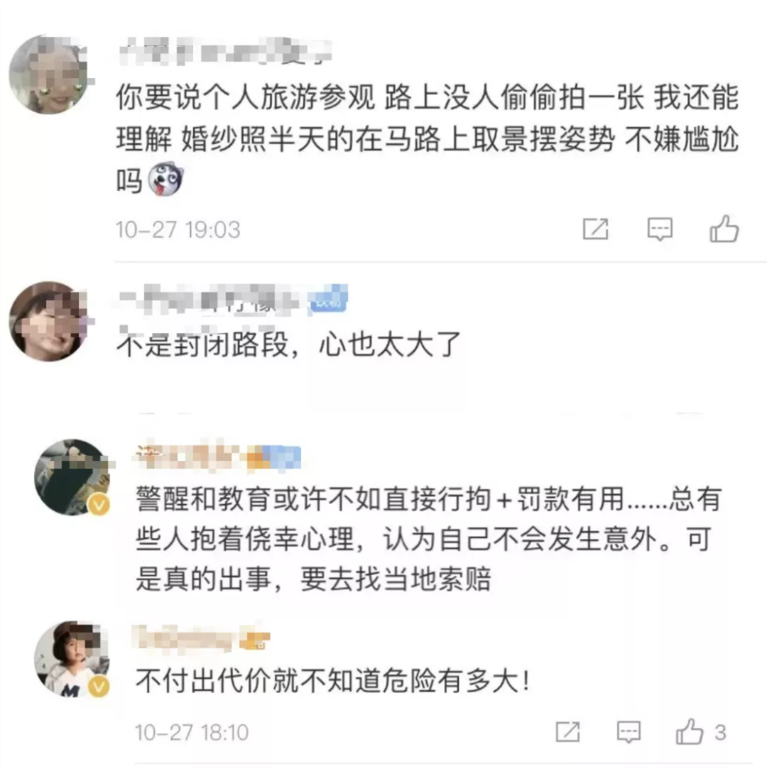 连司机们都要小心驾驶通过的路段,跟风打卡者却肆无忌惮地摆姿势拍照,恨不得拍上100张慢慢选。