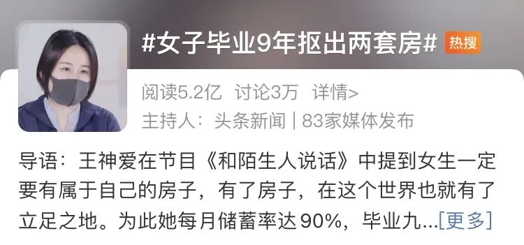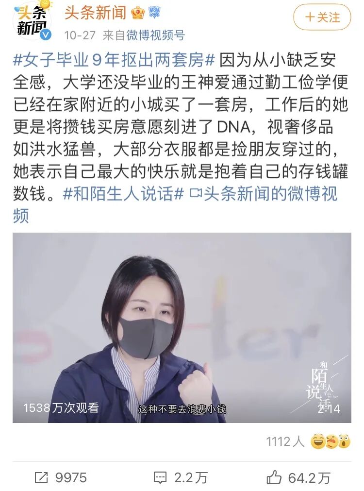 她是话题“女子毕业9年抠出两套房”的主人公,也是近期播出的节目《和陌生人说话》的采访对象。