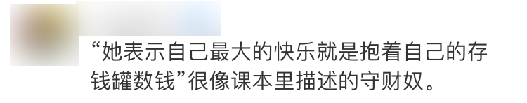 把“抠”和“买房”直接画上等号,把“抠组”成员不线下聚会歪曲成她从不社交,把小学时喜欢数存钱罐里的钱嫁接成她最大的爱好就是躲在家里数钱。