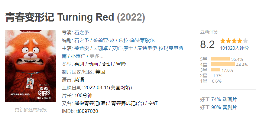 前几天看了一部新上线的动画电影《青春变形记》,讲述可爱活力少女变身红毛“猛兽”的神奇故事。皮克斯出品,在豆瓣上有将近8万名网友给出了4星以上的评价。