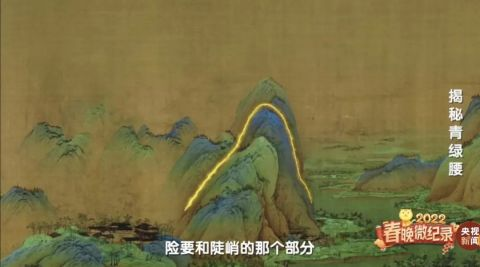“当你看到春晚上六分钟的呈现时,青绿首先是望月,当她的眼睛慢慢低垂,转向后背的时候——这是一种让观众带入《千里江山图》视角的一种感觉。”孟庆旸说,“所以刚开始的时候,它(《千里江山图》)是一座座小山峰,直到融入一个三角形,融入一个主山峰。”