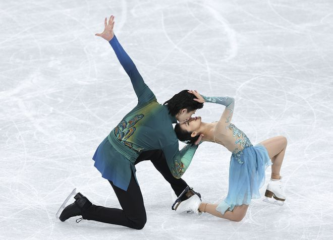 冰舞选手王诗玥、柳鑫宇的考斯滕(花滑比赛服),设计理念也是“千里江山”↓