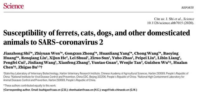 2020年4月,中国农业科学院哈尔滨兽医研究所所长步志高发表在《科学》上的一项研究显示,猫和雪貂对新冠病毒高度易感,犬、猪、鸡和鸭对新冠病毒不易感,相对于猫而言,狗感染的水平更低。