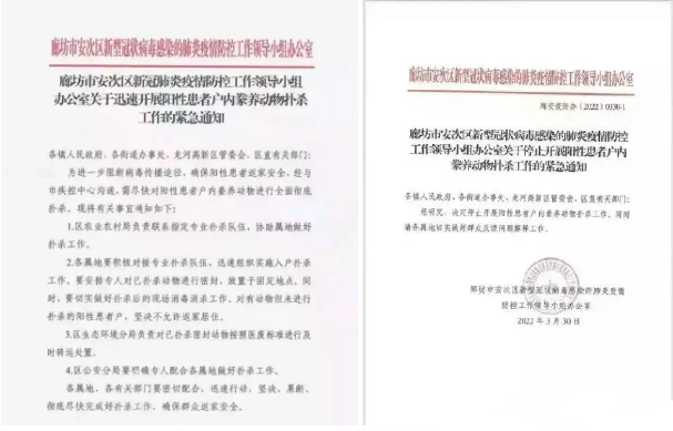 3月份,廊坊市“迅速扑杀豢养动物”的文件发布仅1天就被紧急叫停