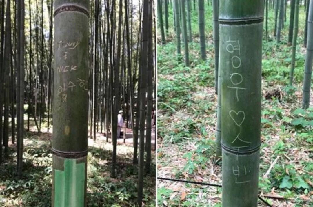 2018年,媒体曝光有100余棵竹子遭到韩文、英文、中文和日文等多国语言的乱刻乱画。