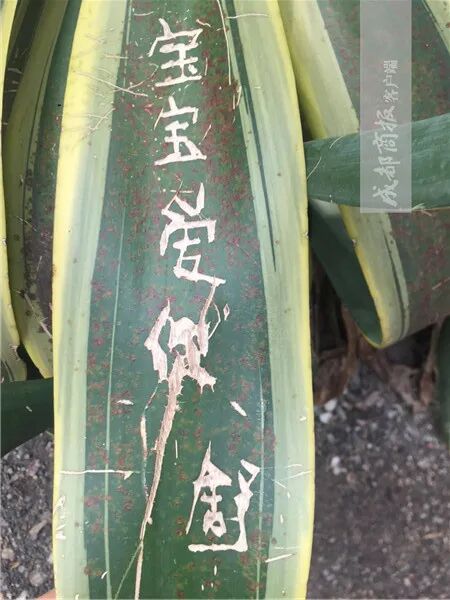 2017年,成都植物园15株珍贵的金边龙舌兰的叶子被多处刻字,最多的一株,刻字叶片多达40片。