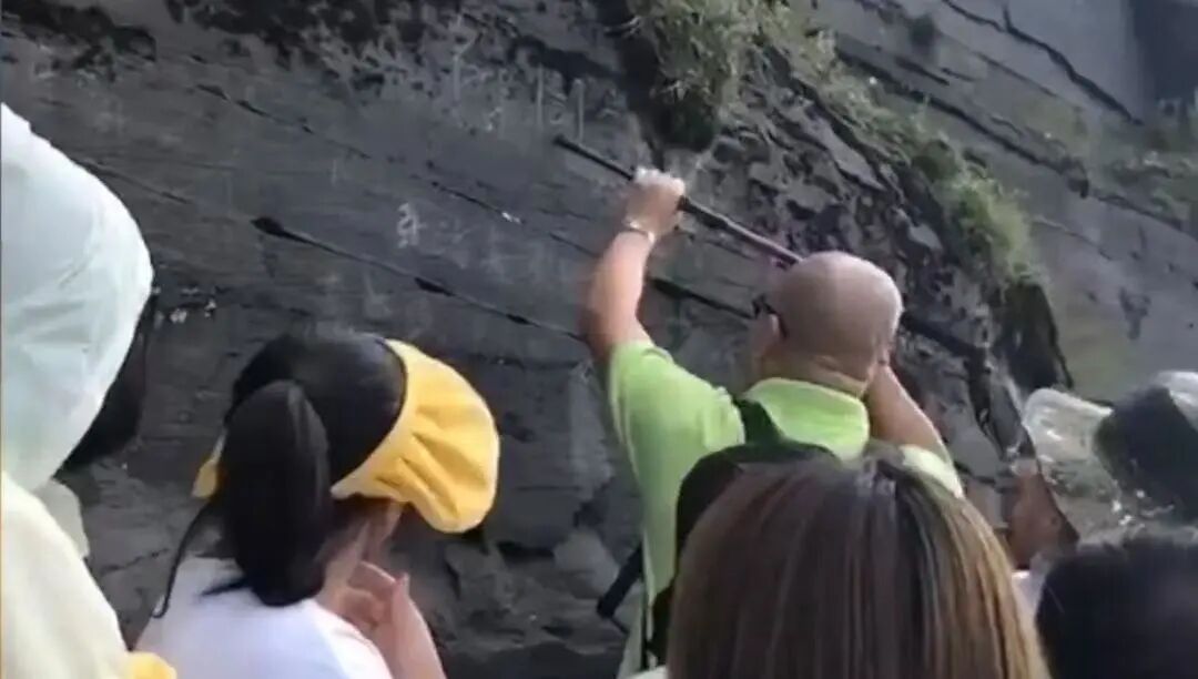 2021年7月,一名游客在排队过程中,用登山杖在世界自然遗产地贵州梵净山的金顶摩崖石壁上刻下“丽水陈国”4个字,引发众怒。