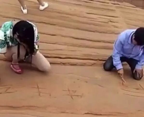 更让人气愤的是,拥有千年历史的地裂喷砂遗迹,竟被游客当成“告白墙”,画满了爱心等各种痕迹。