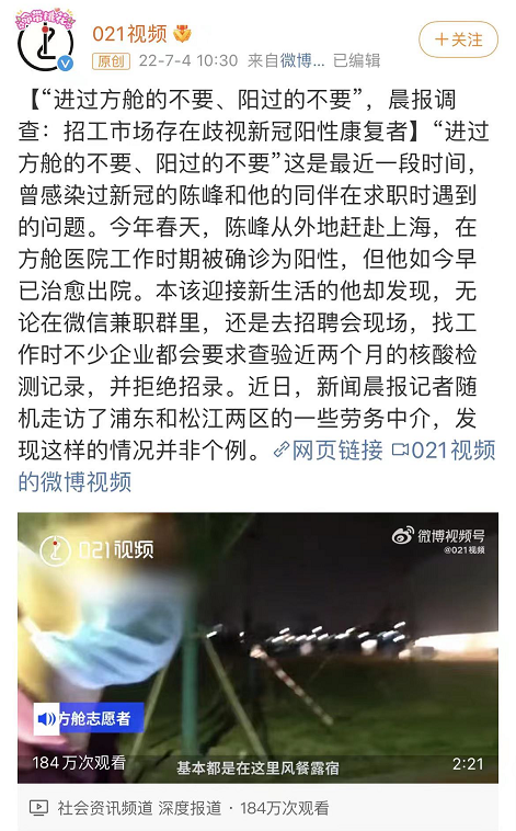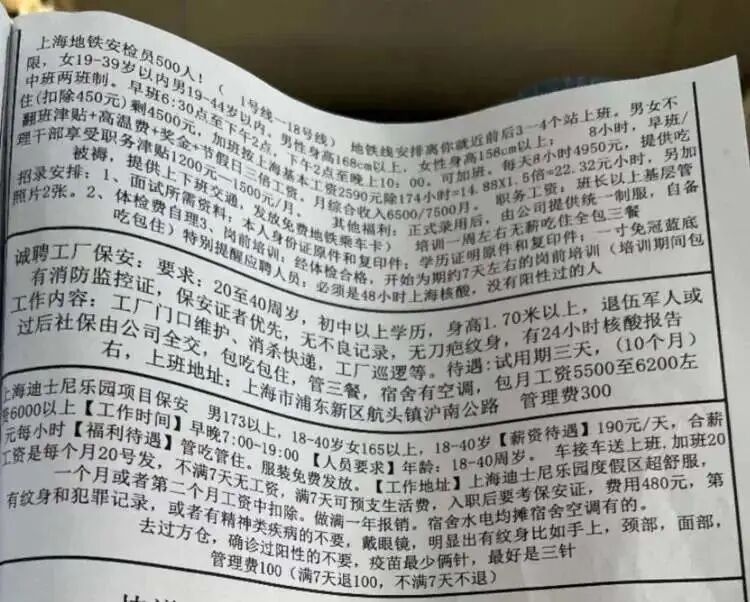 据上海《新闻晨报》报道,上海浦东松江部分劳务中介表示,迪士尼、富士康、大金等公司都“不要阳过的”。比如迪士尼的保安岗位要求“没有阳性记录,没有方舱记录”,大金空调的招聘信息也明确“进过方舱、阳过、做过方舱志愿者的不要”。