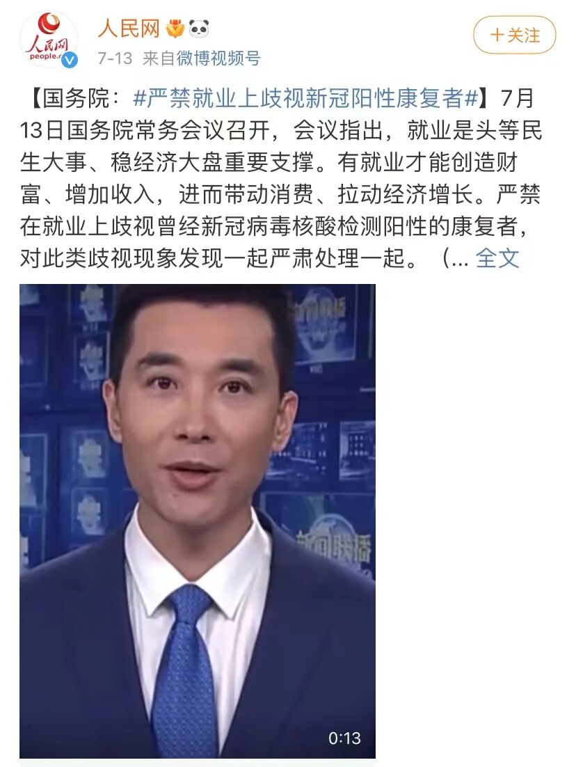 近日国务院常务会议也明确表态,严禁在就业上歧视曾经新冠病毒核酸检测阳性的康复者,对此类歧视现象发现一起,严肃处理一起。