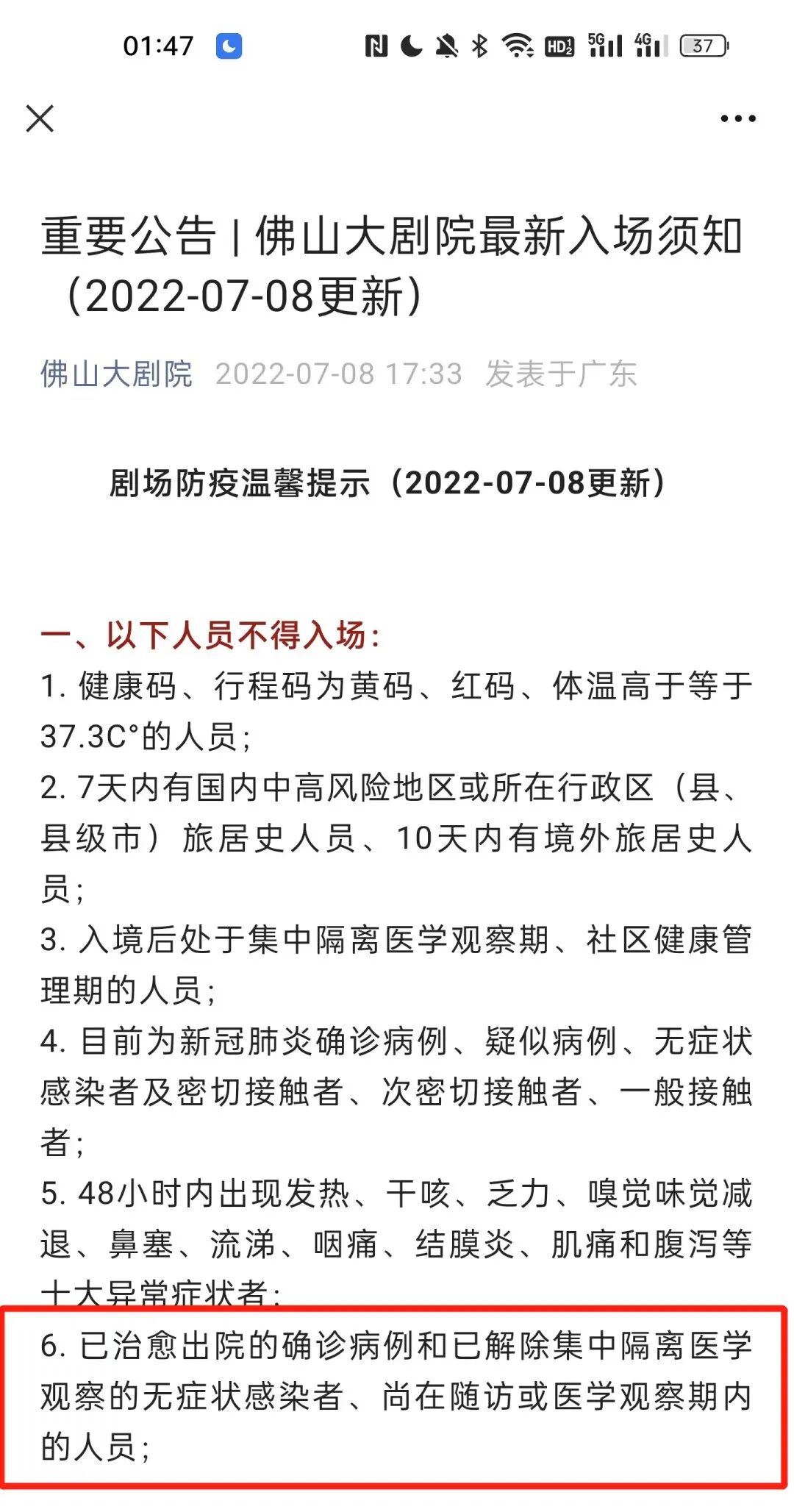 此前,广东佛山的佛山大剧院也曾发布过“已治愈出院的确诊病例禁止入场”的条例。