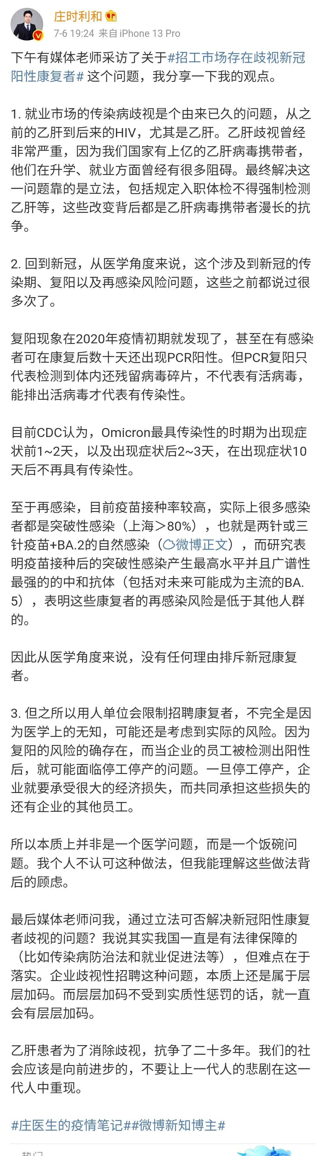 医学科学科普博主@庄时利和 此前也表达过类似观点,之所以用人单位会限制招聘康复者,不完全是因为医学上的无知,可能还是考虑到实际的风险。因为复阳的风险的确存在,而当企业的员工被检测出阳性后,就可能面临停工停产的问题。一旦停工停产,企业就要承受很大的经济损失,而共同承担这些损失的还有企业的其他员工。