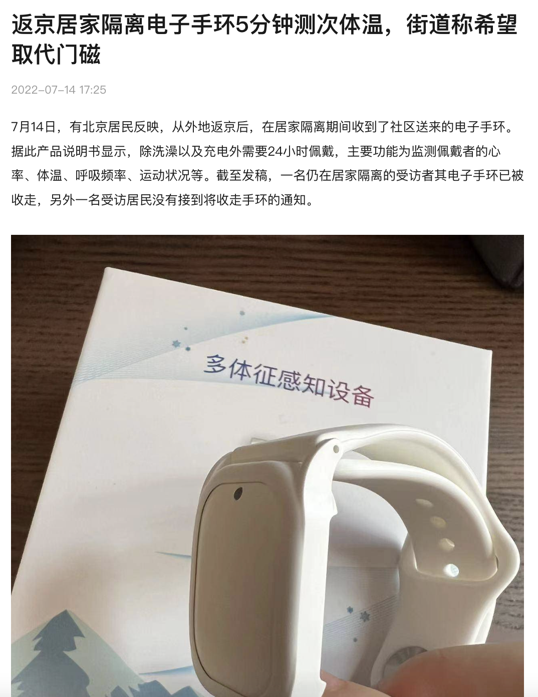 7月14日,科技博主@大红矛 在微博讲述了自己从深圳南山返京后被社区派发了监测体温的电子手环的经历,瞬间引爆了网络争议。该博主表示,该手环具备联网功能,“肯定能记录行动轨迹,跟电子镣铐也差不多了”。但北京市卫健委已明确回应,从未发布过居家隔离人员需佩戴电子手环的相关政策。