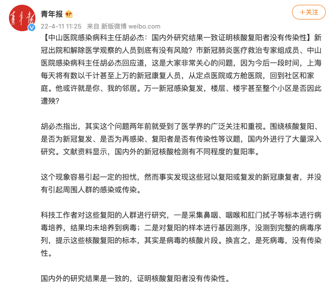 多地卫健委也都曾在不同场合公开发声表示,就目前观测到的病例,新冠患者痊愈后,即使核酸检测出现复阳也不具有传染性。但这些科普性质的权威言论显然并没有战胜公众对病毒再次复发传播的恐慌。