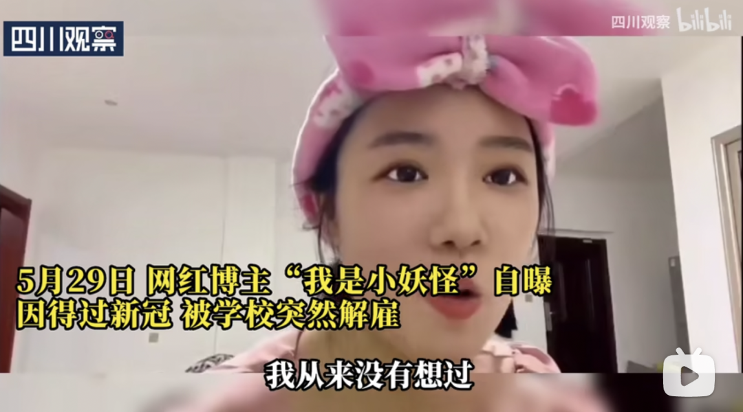 B站UP主“我是小妖怪”也曾在自己的视频中表示,原本已经和一家教育机构谈好了,但却在试讲结束后被校方匆匆辞退,只是因为她曾经“得过新冠”。