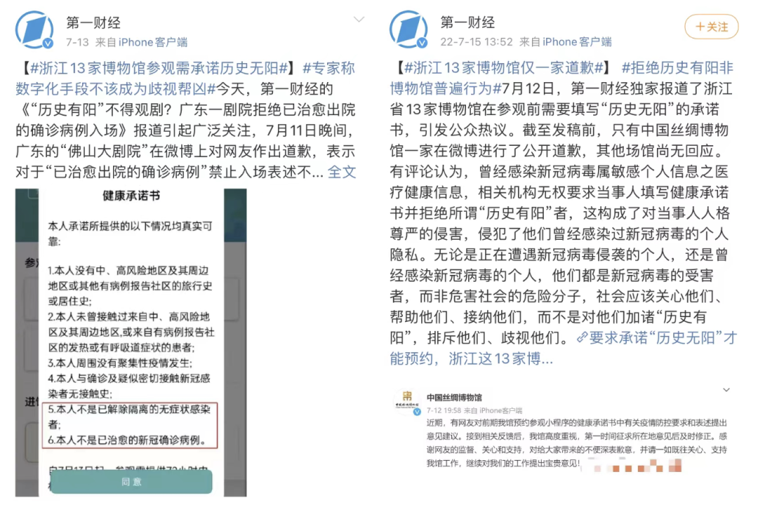 据第一财经报道,包括中国丝绸博物馆(杭州)、杭州孔庙、中国动漫博物馆等在内的13家博物馆或纪念馆,要求预约人员参观前填写健康承诺书。这份健康承诺书中的第五条和第六条分别是“本人不是已解除隔离的无症状感染者”和“本人不是已治愈的新冠确诊病例”。