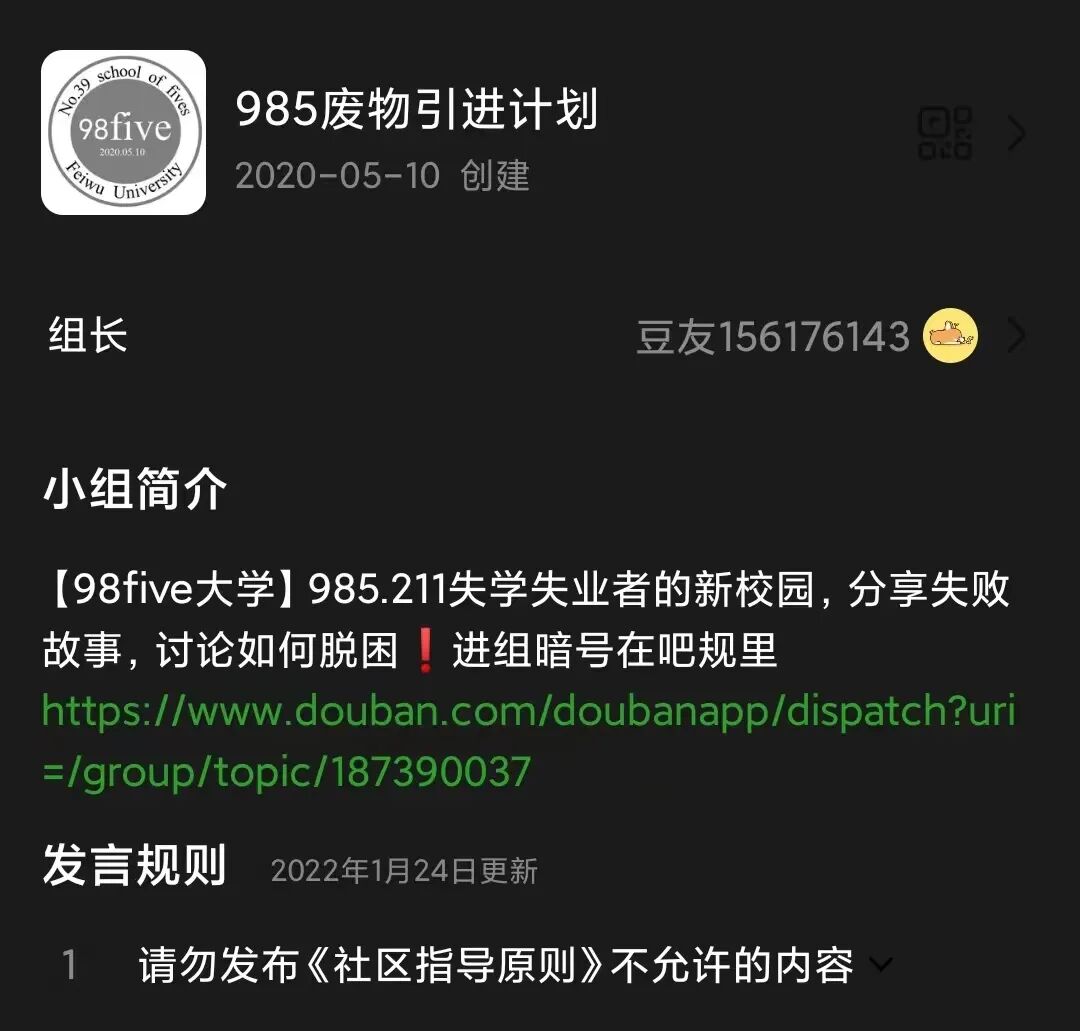 我们从这个词的诞生地——“985废物引进计划”这个小组的组名里就能感受到,不论是用这个词形容自己的人群,还是它最初所使用的范围,都带着浓浓的“自嘲”意味。