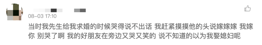 有网友在视频下面回忆先生向自己求婚时的场景,她先生哭得哇哇的。一个男人不会轻易掉眼泪,除非他娶到了自己很爱的人。