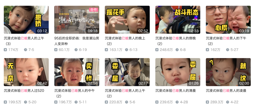 视频UP主“淦淦惹”,一个结婚以后全职带娃的年轻奶爸,在视频网站上发布了一系列“已婚男人的一天”视频,所有看过的人沉浸式体验了一个已婚男人的上午、中午、下午、晚上……