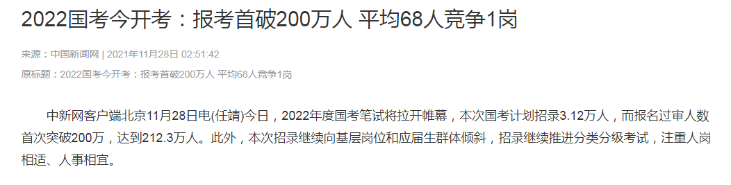 2022年国家公务员考试计划招录3万余人,但实际报名人数却超过了200万,不仅刷新了历年新高,而且最热门岗位的报录比甚至达到了1∶20000。