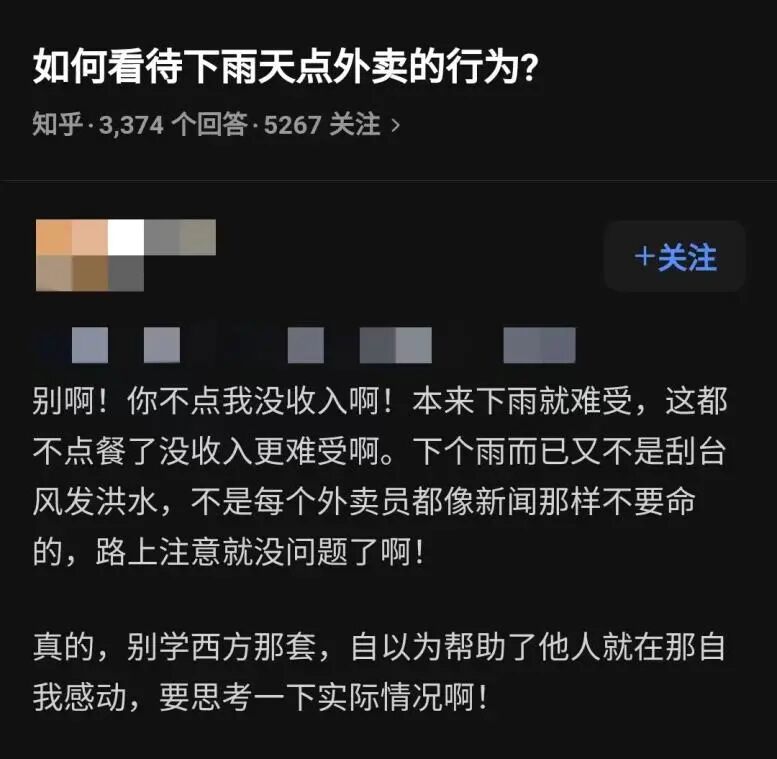外卖是现代人生活中最常见的事物之一,我们自己也经常会纠结“下雨天要不要点外卖”的问题。但是确实有这么一群人, 自己不点外卖倒也罢了,还要在生活中或者网络上,谴责批判、冷嘲热讽“下雨天点外卖”的人。这样的人,相信很多人都遇到过。