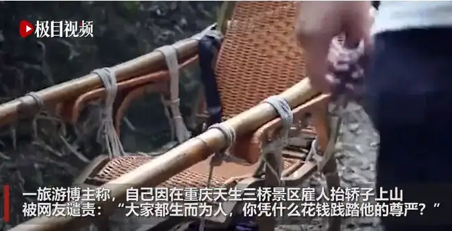近日,一名旅游博主在网络上发视频称,自己在重庆某景区游玩时,因为雇人抬轿子(当地称为滑竿)上山,遭遇了网络暴力。那些所谓为轿夫“仗义执言”的“热心网友”谴责道: