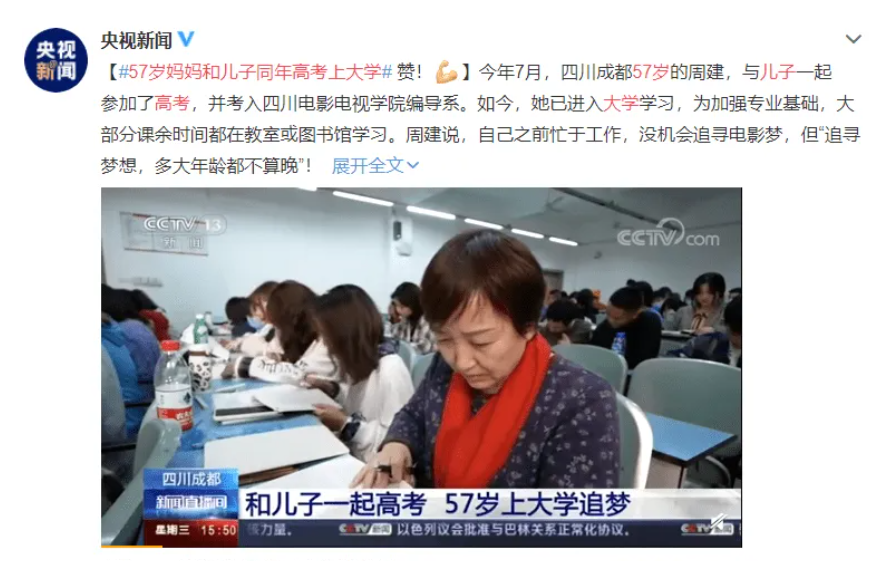 于是,阿姨和儿子于同一年参加高考,她成为了四川电影电视学院编导系的一名大一新生。