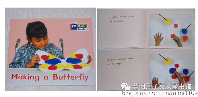在这一点上,国外的一些分级阅读书做得比较好,比如我最喜欢的PM系列分级阅读书,最初级的红色阅读系列,内容都很简单,一本书一个小故事,词汇量也少,基本上一页就一句话。比如曾经在《英文绘本怎么读》里介绍过的《Making a butterfly》,就是很简单地用英文告诉你怎么做画一只蝴蝶,句式带有重复性“Look at the red paint on the wing”,翻一页后是“Look at theblue paint on the wing”,然后是黄色的...在循环反复地读这些句子时,孩子就会很容易理解并记住。